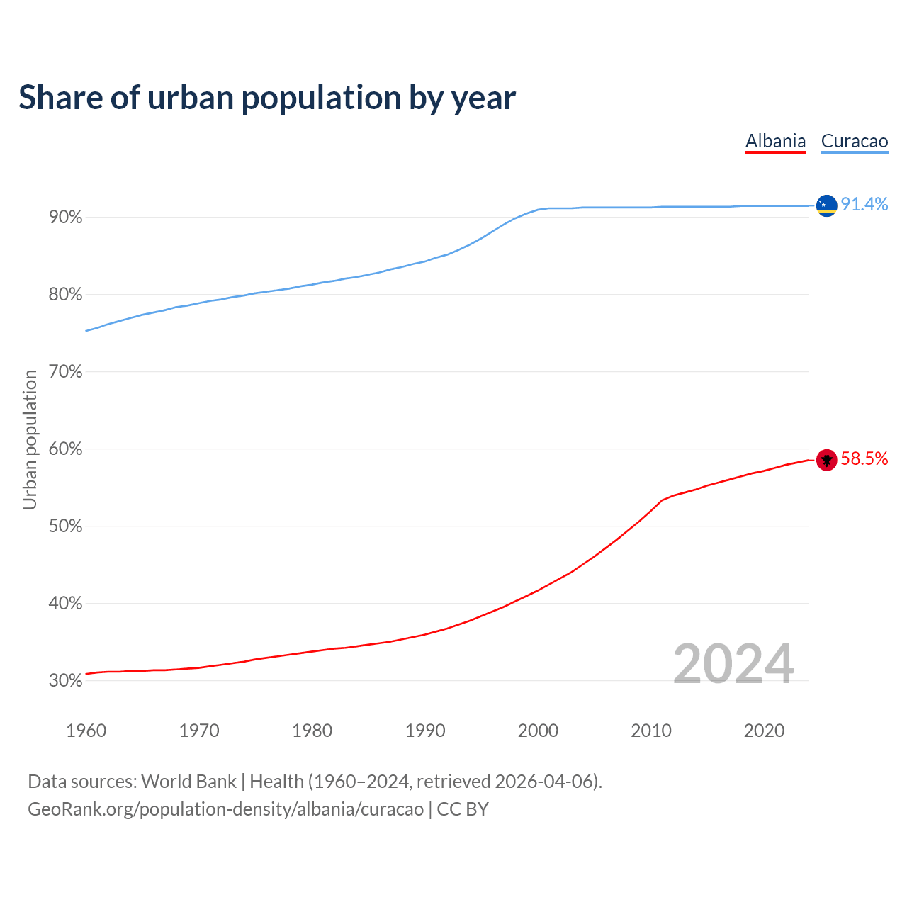 From 2004 to 2024, the share of urban population changed from 45% to 58.5% in Albania and from 91.2% to 91.4% in Curacao.