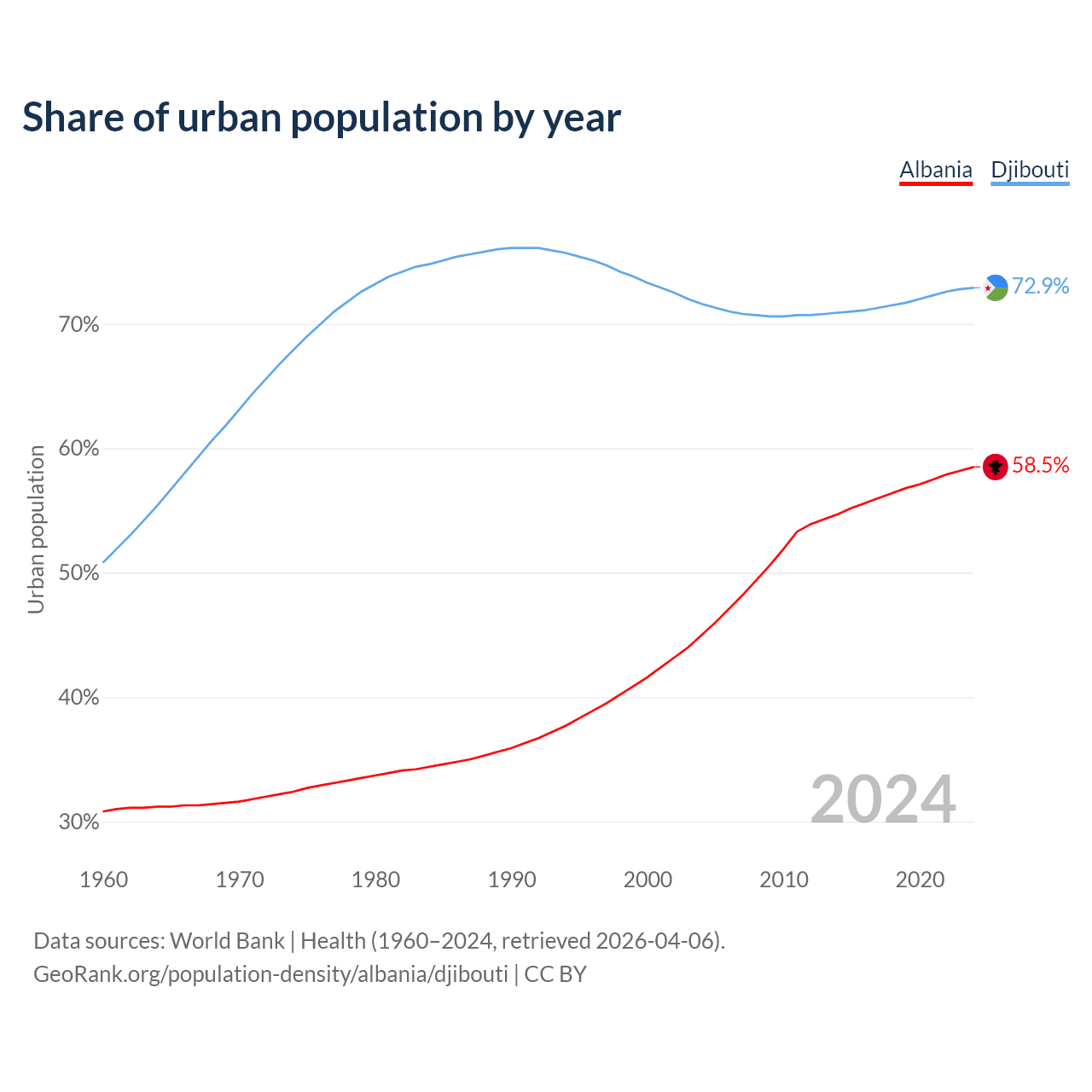 From 2004 to 2024, the share of urban population changed from 45% to 58.5% in Albania and from 71.6% to 72.9% in Djibouti.