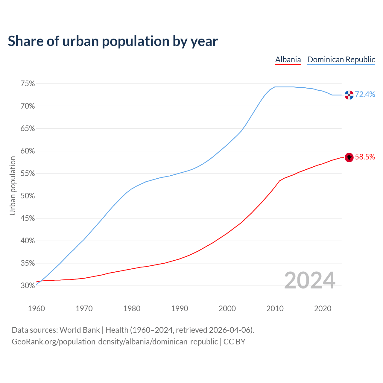 From 2004 to 2024, the share of urban population changed from 45% to 58.5% in Albania and from 65.9% to 72.4% in the Dominican Republic.