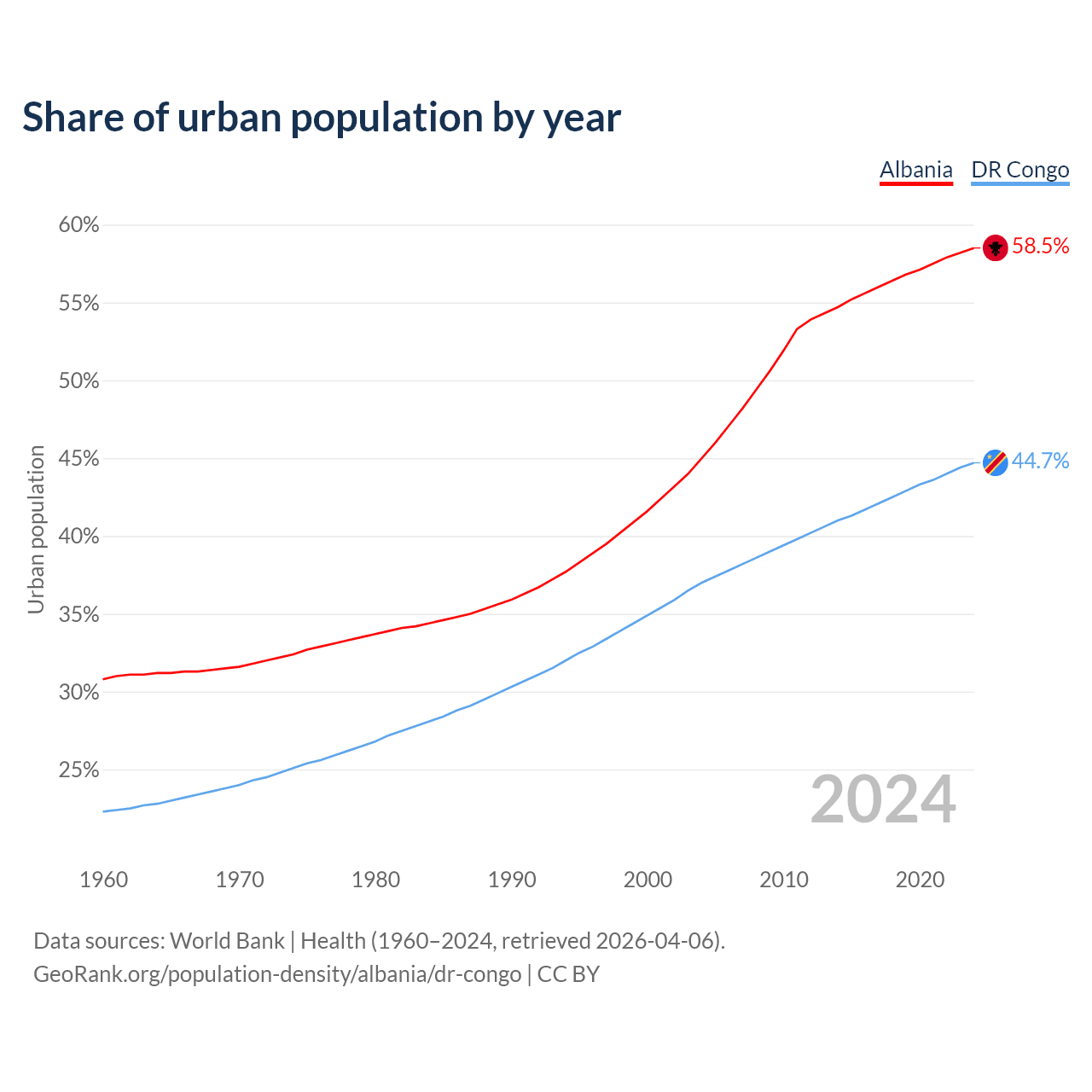 From 2004 to 2024, the share of urban population changed from 45% to 58.5% in Albania and from 37% to 44.7% in the DR Congo.