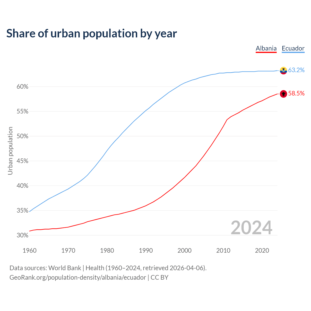 From 2004 to 2024, the share of urban population changed from 45% to 58.5% in Albania and from 61.8% to 63.2% in Ecuador.