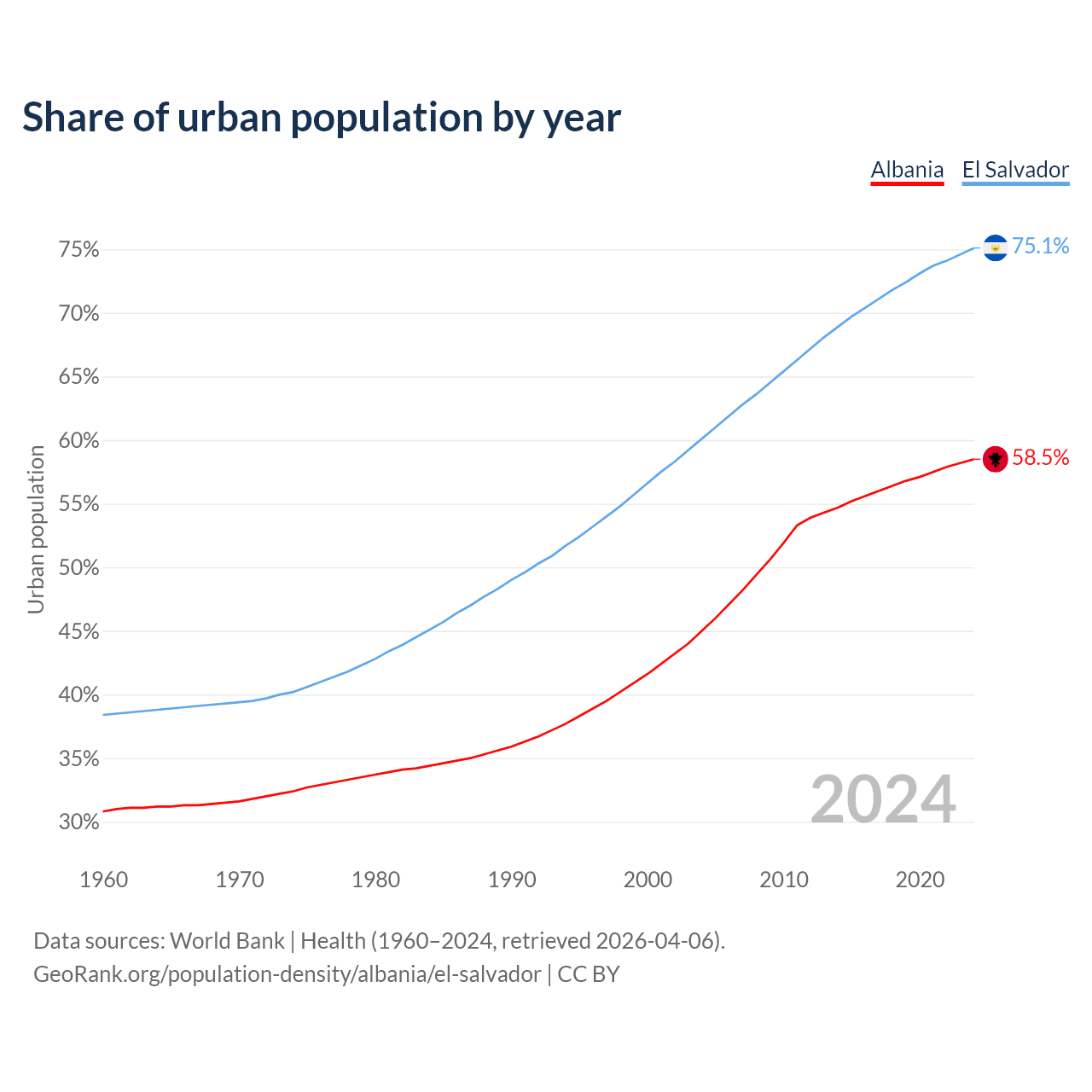 From 2004 to 2024, the share of urban population changed from 45% to 58.5% in Albania and from 60.1% to 75.1% in El Salvador.