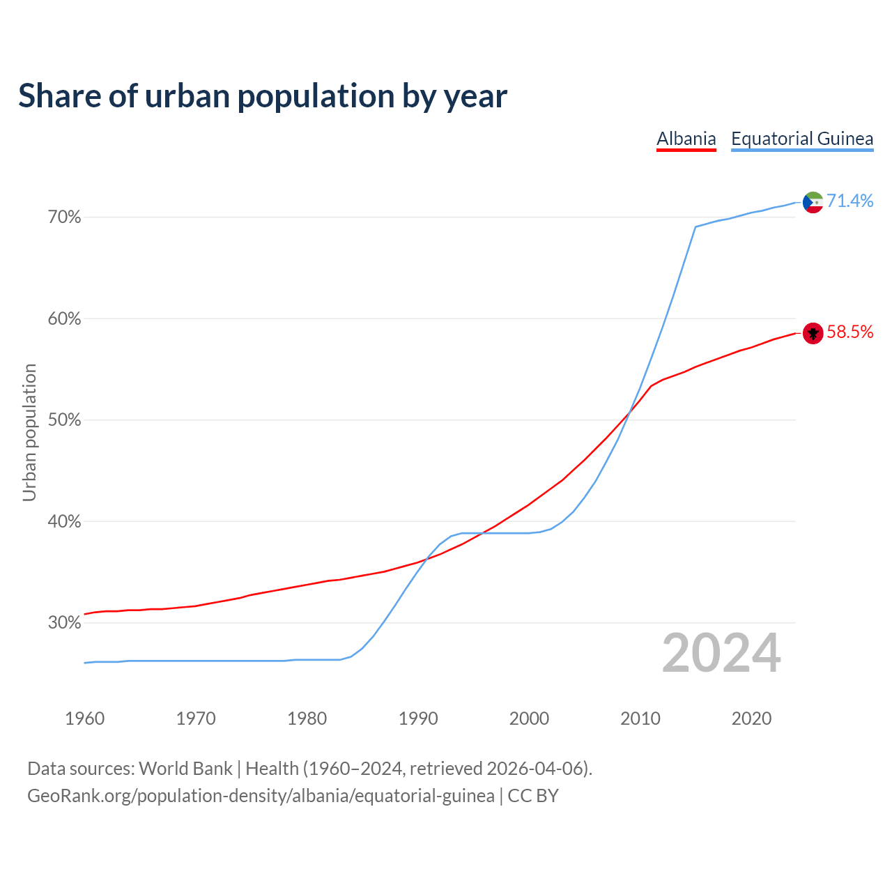 From 2004 to 2024, the share of urban population changed from 45% to 58.5% in Albania and from 40.9% to 71.4% in Equatorial Guinea.