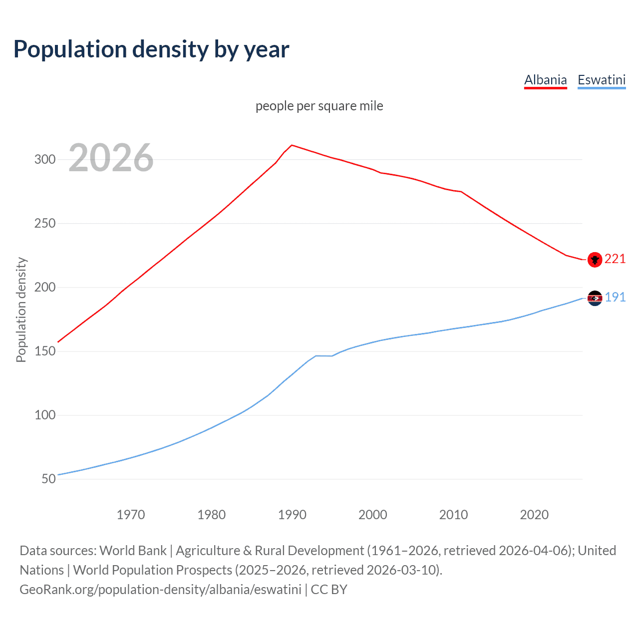 From 2006 to 2026, population density in Albania decreased by 21.7%, compared to a 17.1% growth in Eswatini.