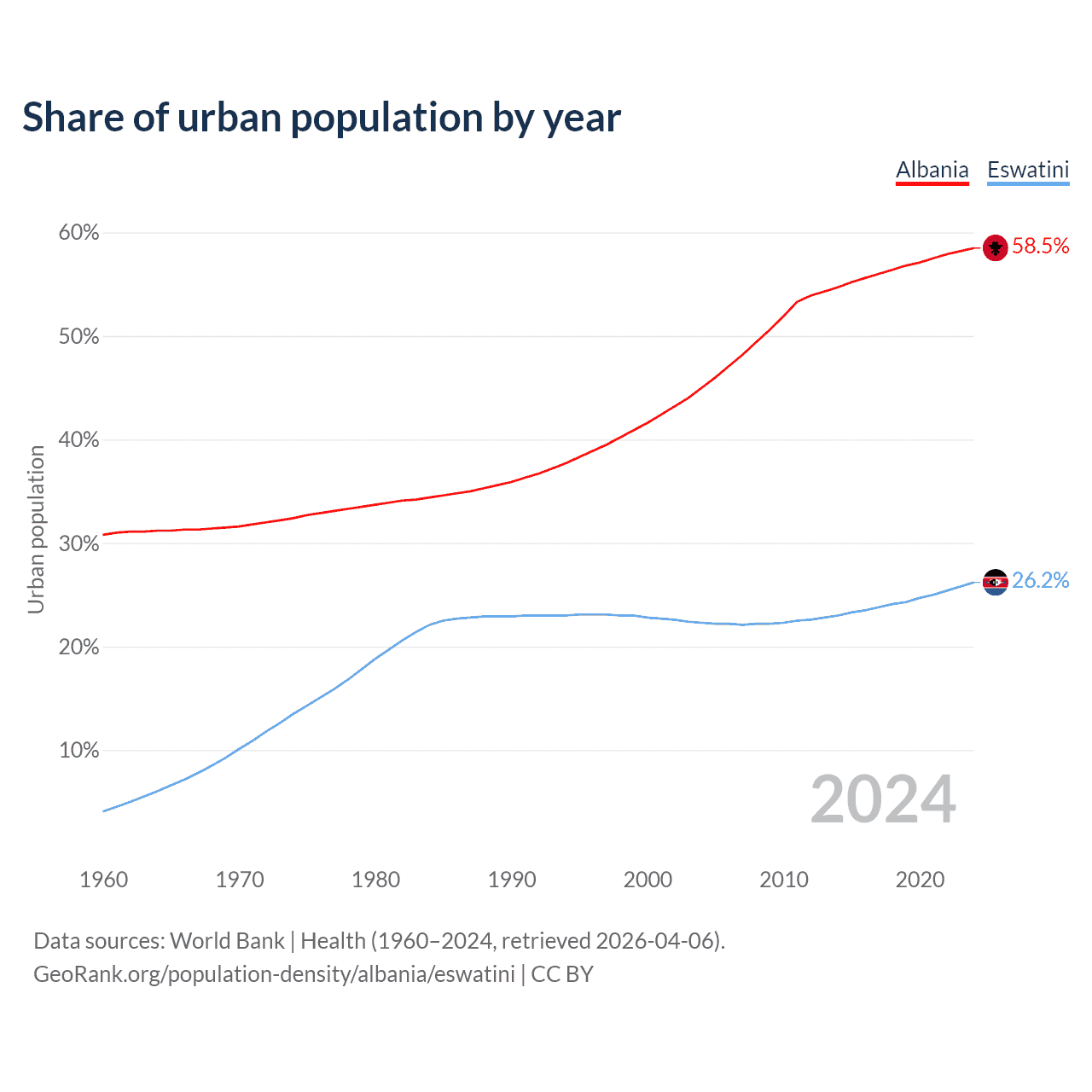 From 2004 to 2024, the share of urban population changed from 45% to 58.5% in Albania and from 22.3% to 26.2% in Eswatini.