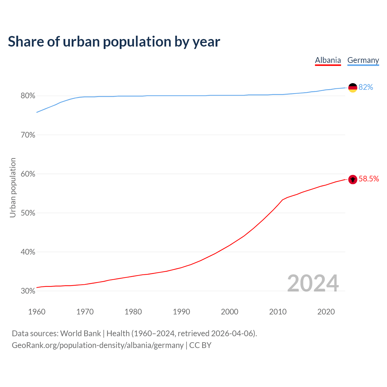From 2004 to 2024, the share of urban population changed from 45% to 58.5% in Albania and from 80.2% to 82% in Germany.