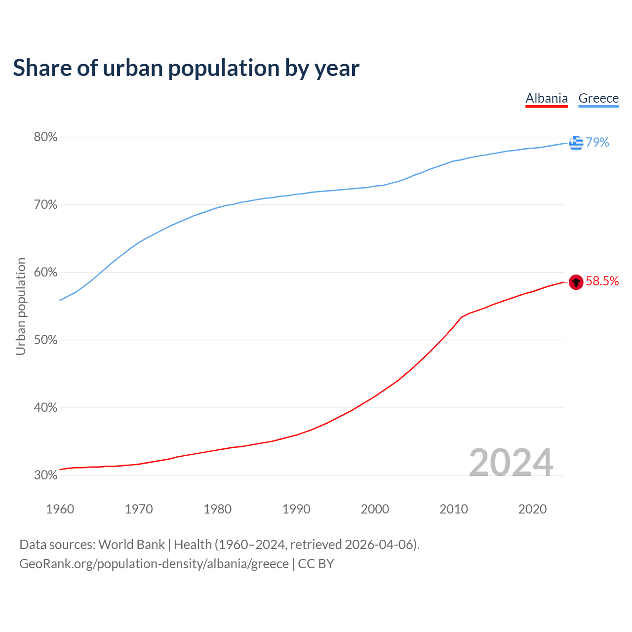 From 2004 to 2024, the share of urban population changed from 45% to 58.5% in Albania and from 73.8% to 79% in Greece.