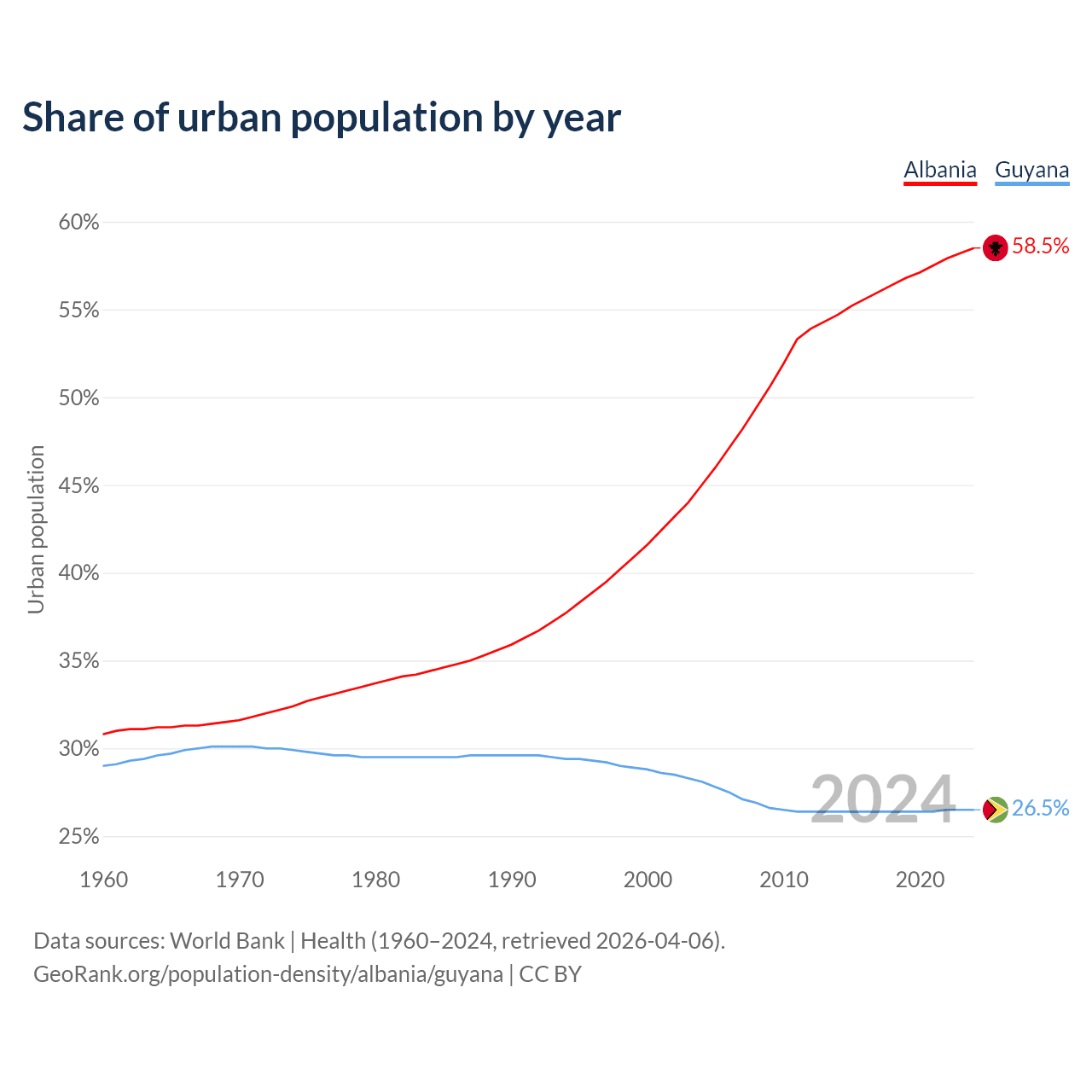 From 2004 to 2024, the share of urban population changed from 45% to 58.5% in Albania and from 28.1% to 26.5% in Guyana.
