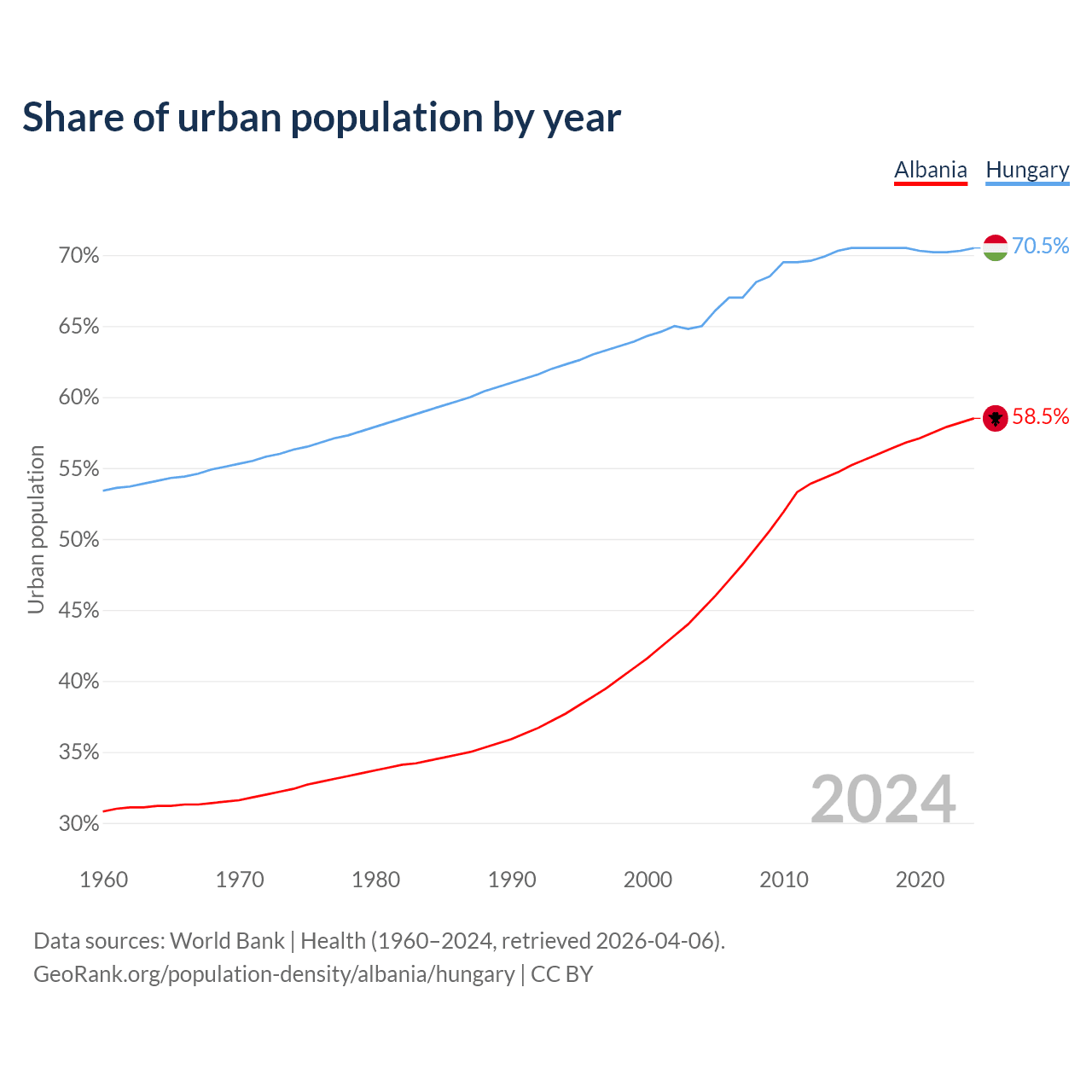 From 2004 to 2024, the share of urban population changed from 45% to 58.5% in Albania and from 65% to 70.5% in Hungary.