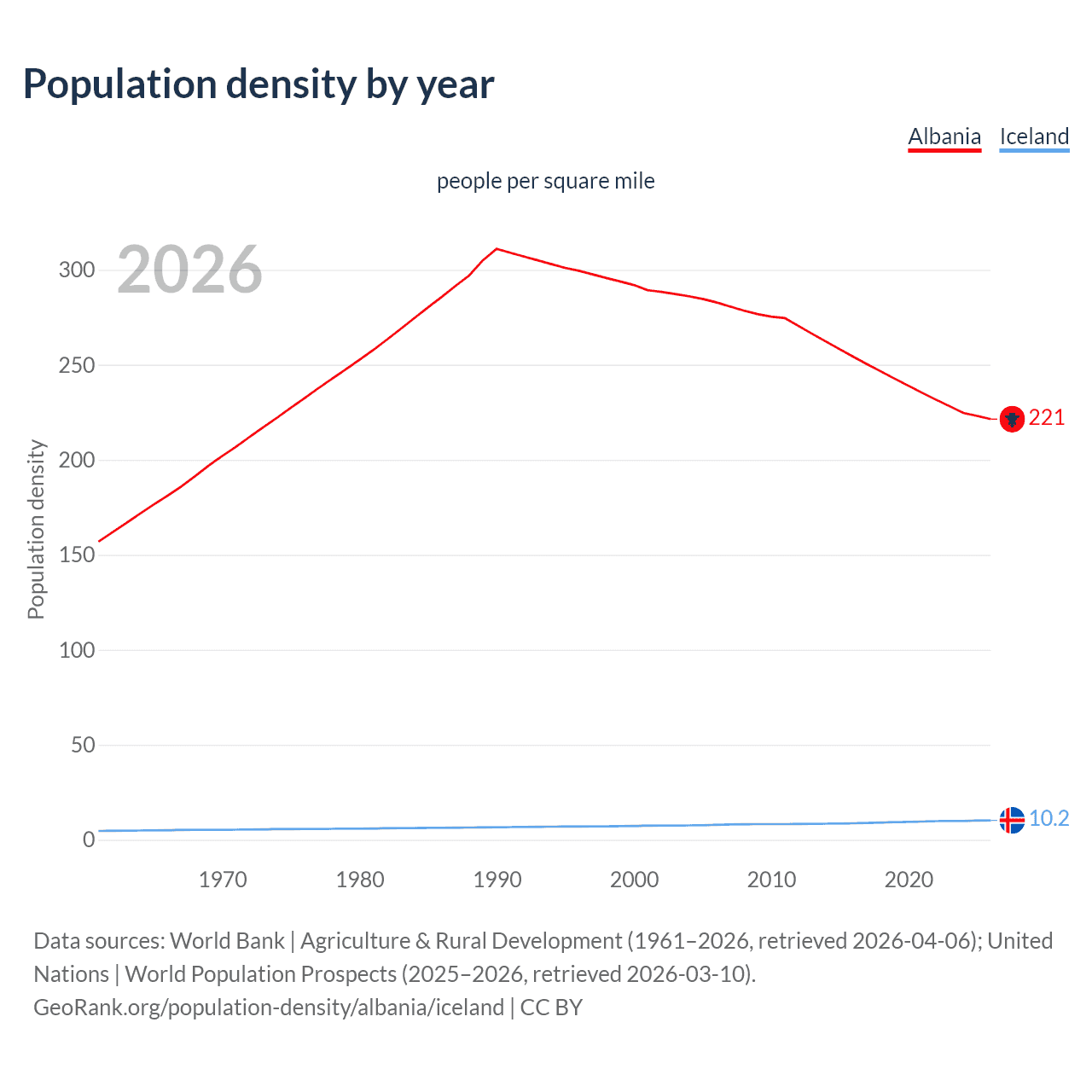 From 2006 to 2026, population density in Albania decreased by 21.7%, compared to a 29.7% growth in Iceland.