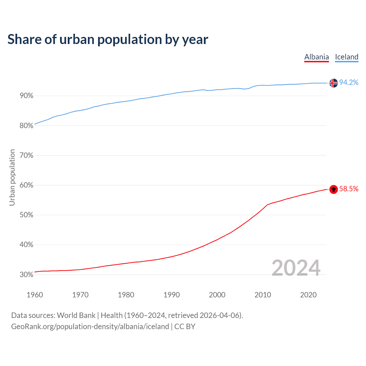 From 2004 to 2024, the share of urban population changed from 45% to 58.5% in Albania and from 92.4% to 94.2% in Iceland.