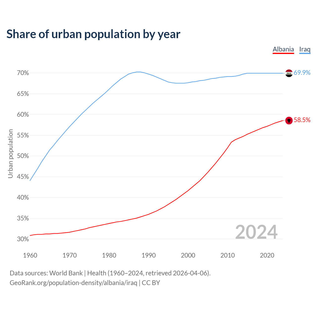 From 2004 to 2024, the share of urban population changed from 45% to 58.5% in Albania and from 68.2% to 69.9% in Iraq.