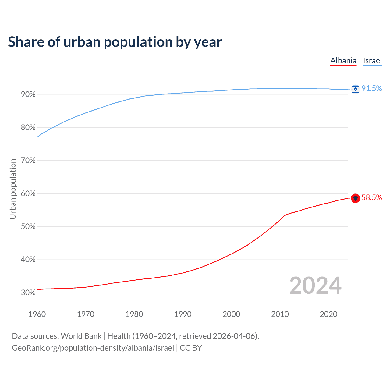 From 2004 to 2024, the share of urban population changed from 45% to 58.5% in Albania and from 91.6% to 91.5% in Israel.
