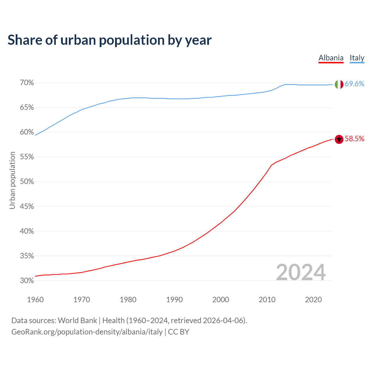 From 2004 to 2024, the share of urban population changed from 45% to 58.5% in Albania and from 67.5% to 69.6% in Italy.