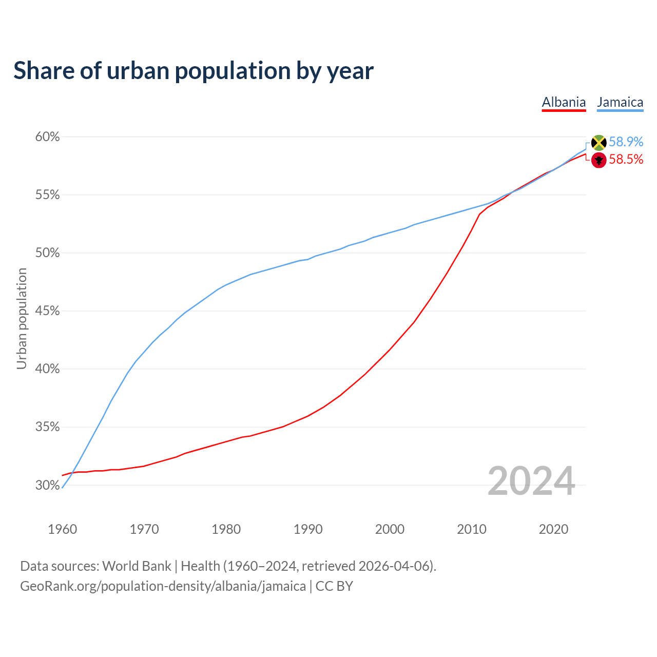 From 2004 to 2024, the share of urban population changed from 45% to 58.5% in Albania and from 52.6% to 58.9% in Jamaica.