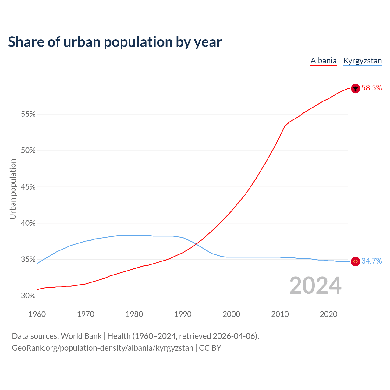 From 2004 to 2024, the share of urban population changed from 45% to 58.5% in Albania and from 35.3% to 34.7% in Kyrgyzstan.