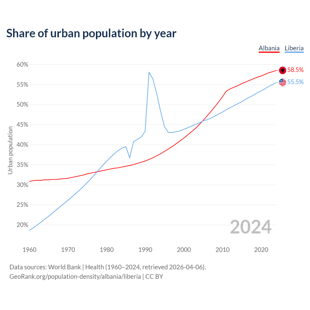 From 2004 to 2024, the share of urban population changed from 45% to 58.5% in Albania and from 45.4% to 55.5% in Liberia.