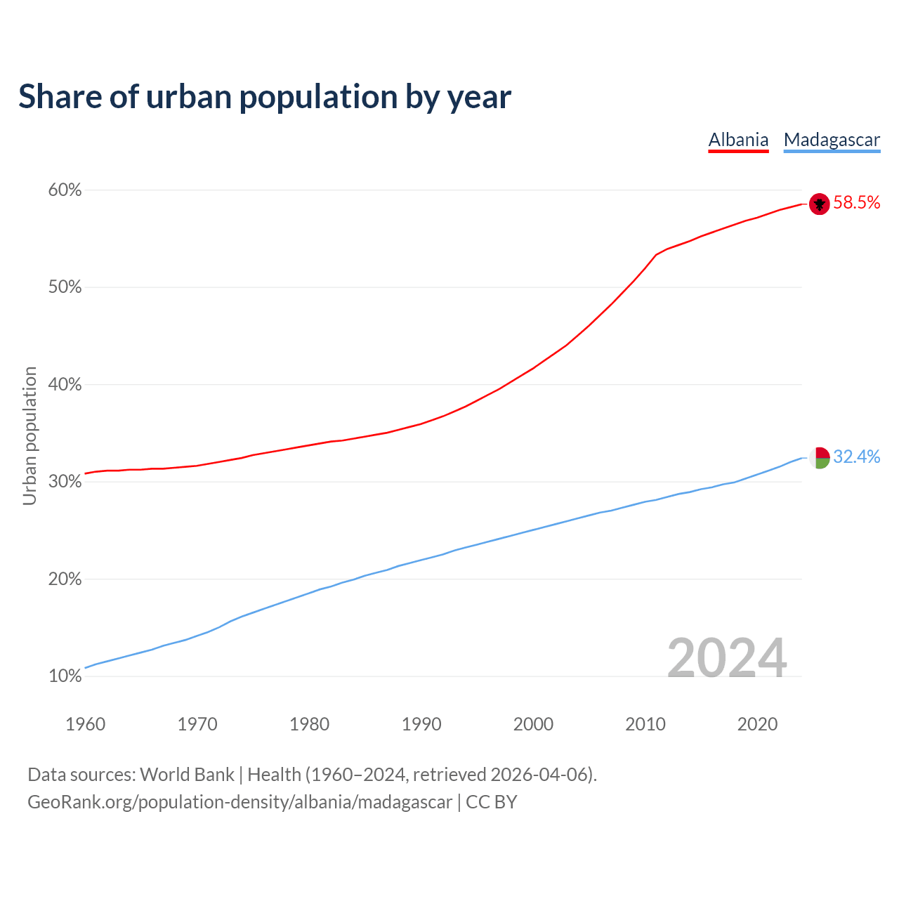 From 2004 to 2024, the share of urban population changed from 45% to 58.5% in Albania and from 26.2% to 32.4% in Madagascar.