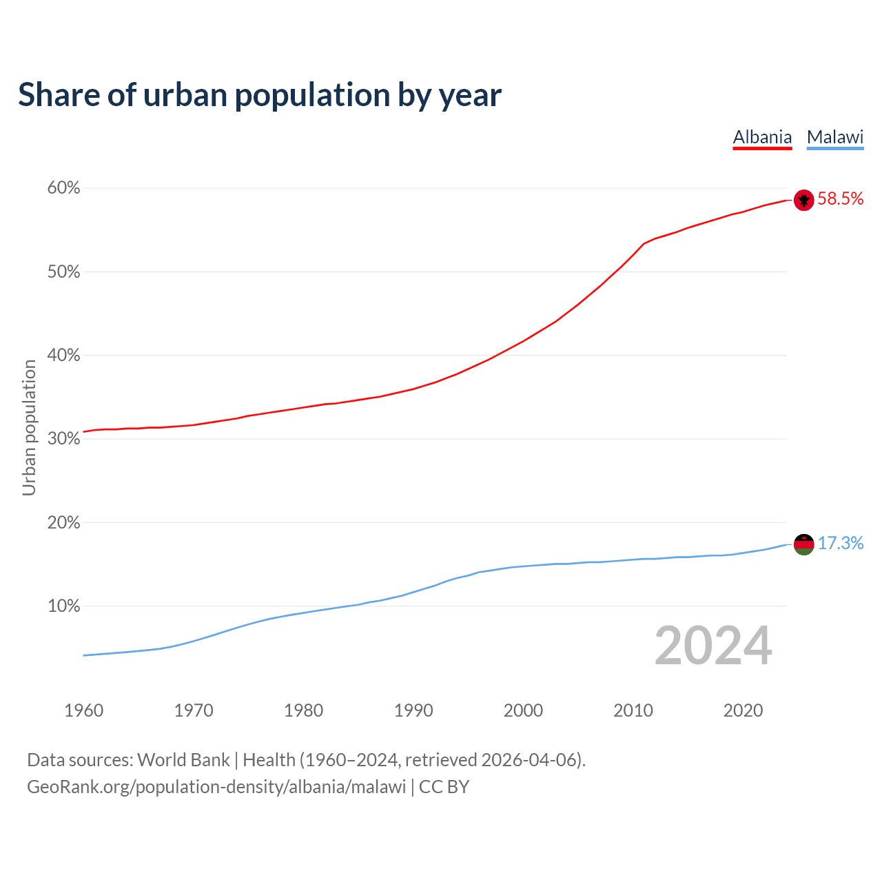 From 2004 to 2024, the share of urban population changed from 45% to 58.5% in Albania and from 15% to 17.3% in Malawi.