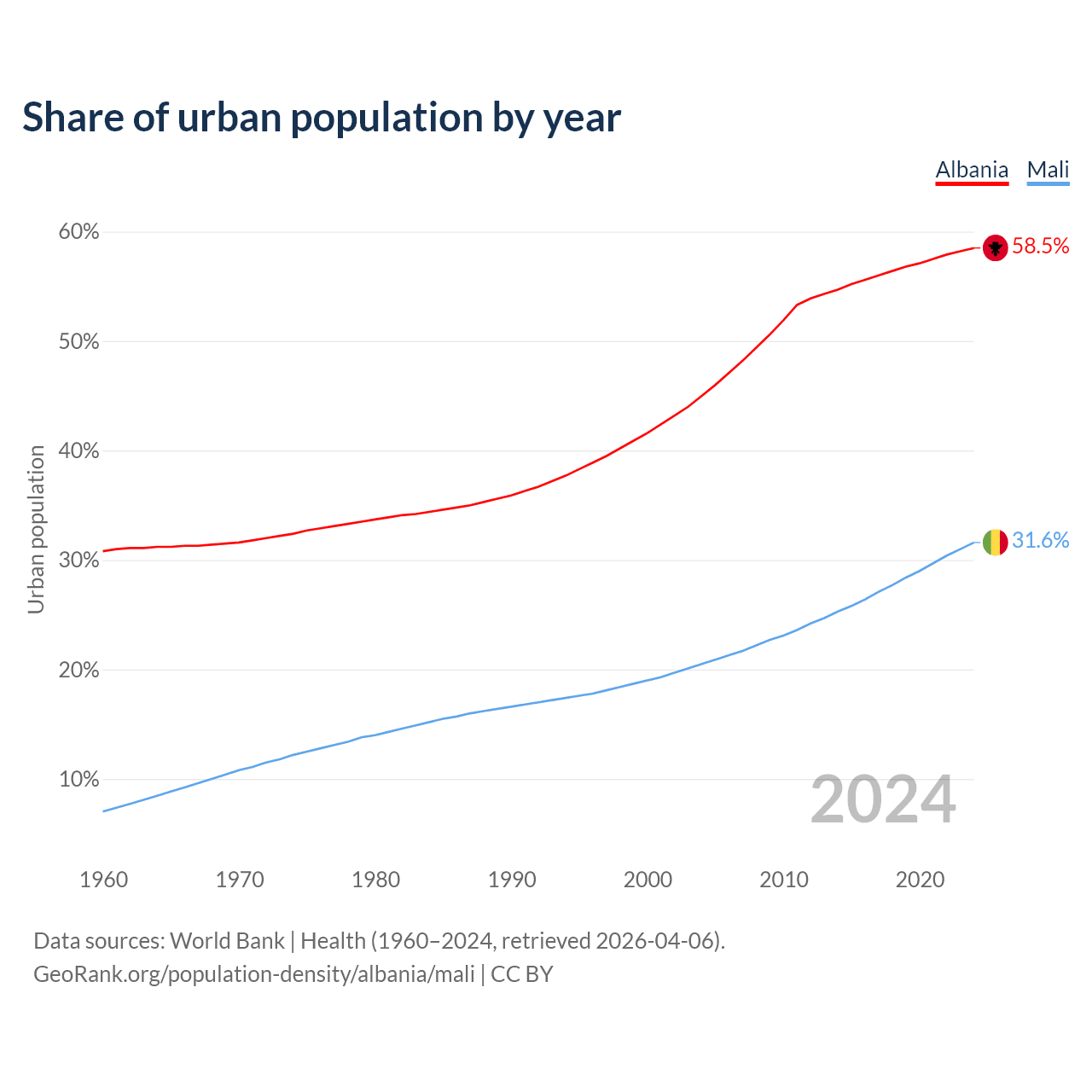 From 2004 to 2024, the share of urban population changed from 45% to 58.5% in Albania and from 20.5% to 31.6% in Mali.