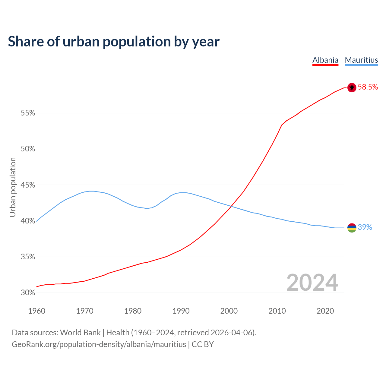 From 2004 to 2024, the share of urban population changed from 45% to 58.5% in Albania and from 41.3% to 39% in Mauritius.