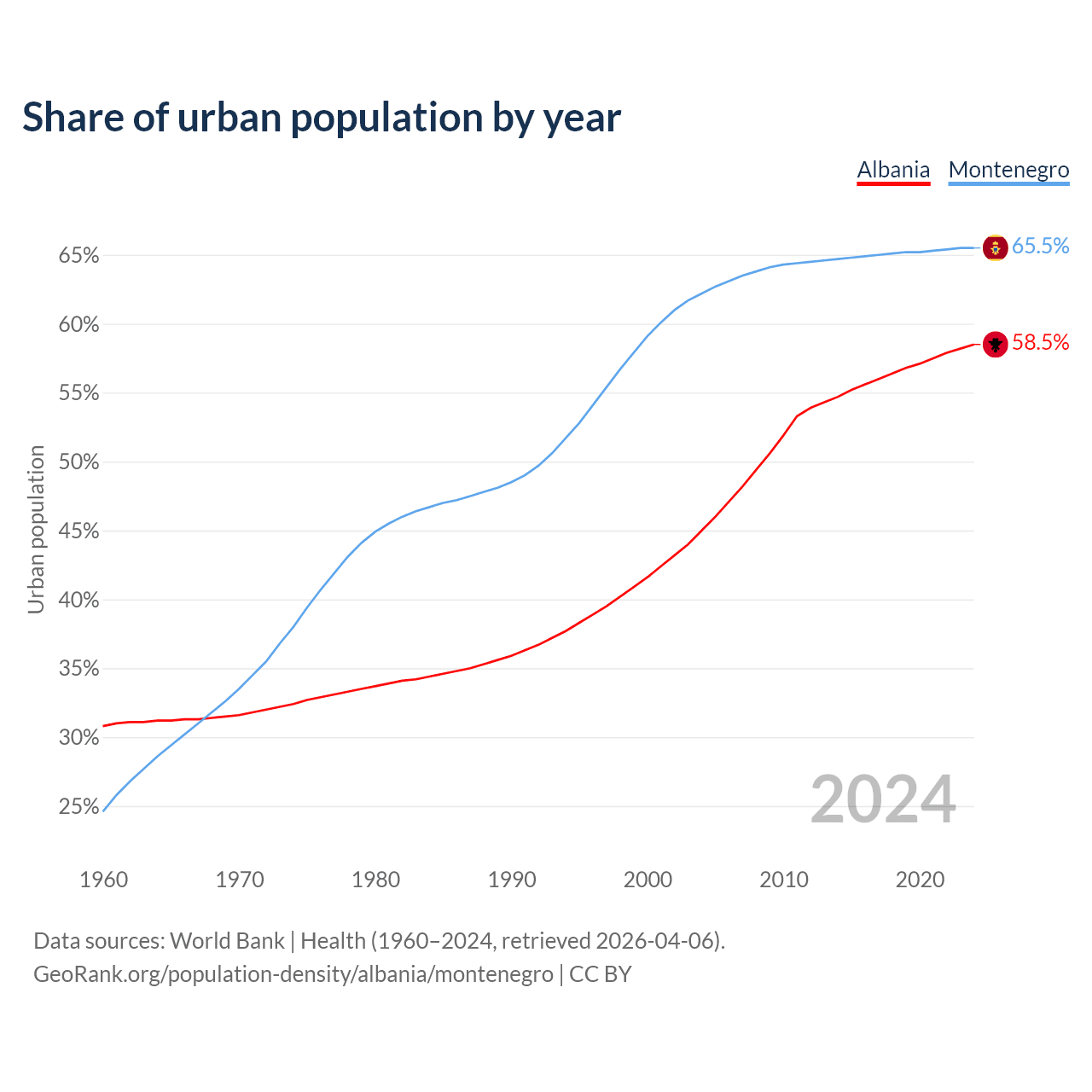 From 2004 to 2024, the share of urban population changed from 45% to 58.5% in Albania and from 62.2% to 65.5% in Montenegro.