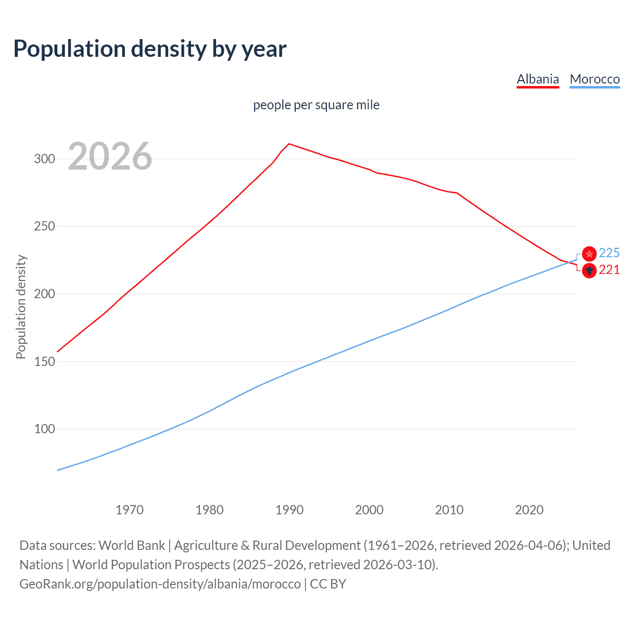 From 2006 to 2026, population density in Albania decreased by 21.7%, compared to a 26% growth in Morocco.