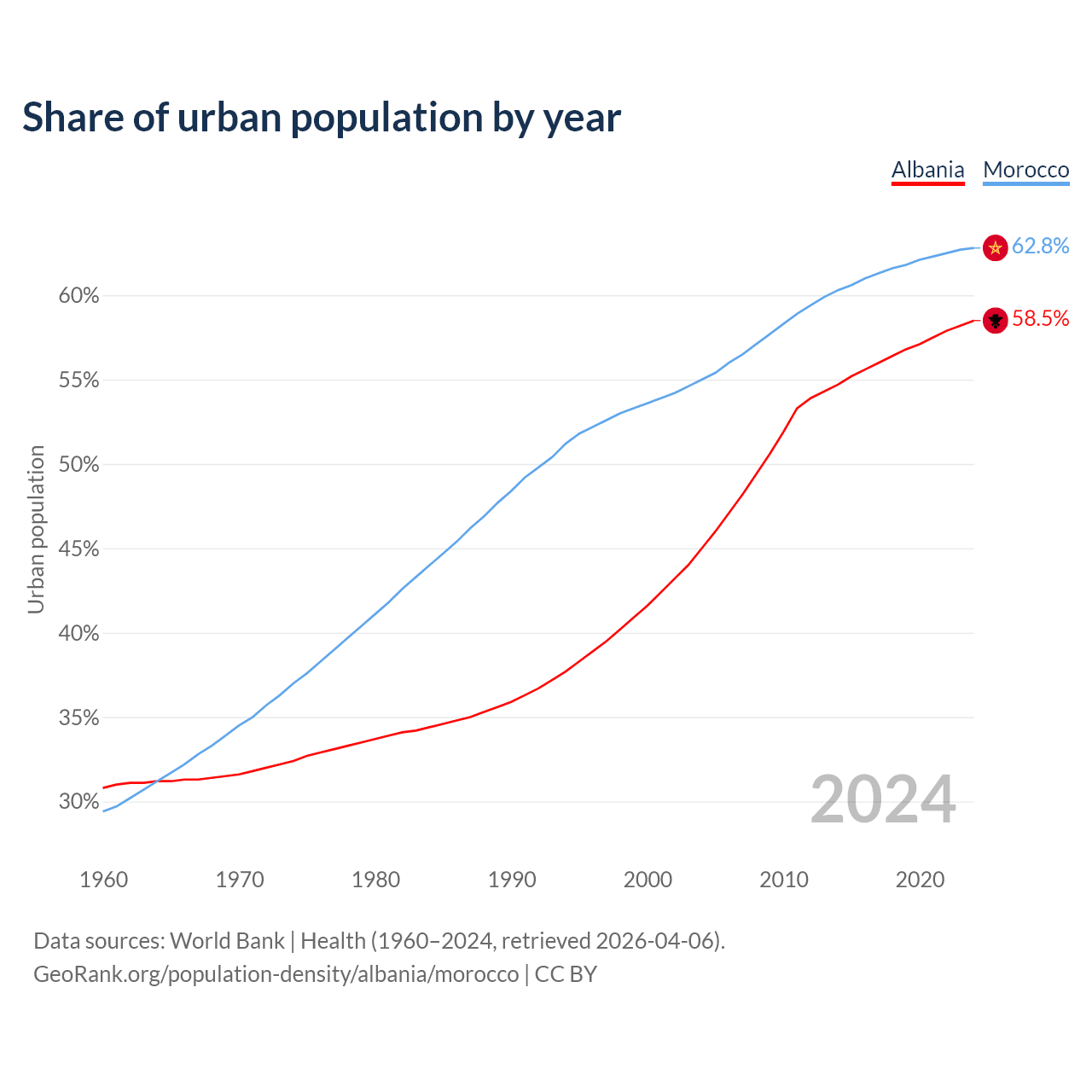 From 2004 to 2024, the share of urban population changed from 45% to 58.5% in Albania and from 55% to 62.8% in Morocco.
