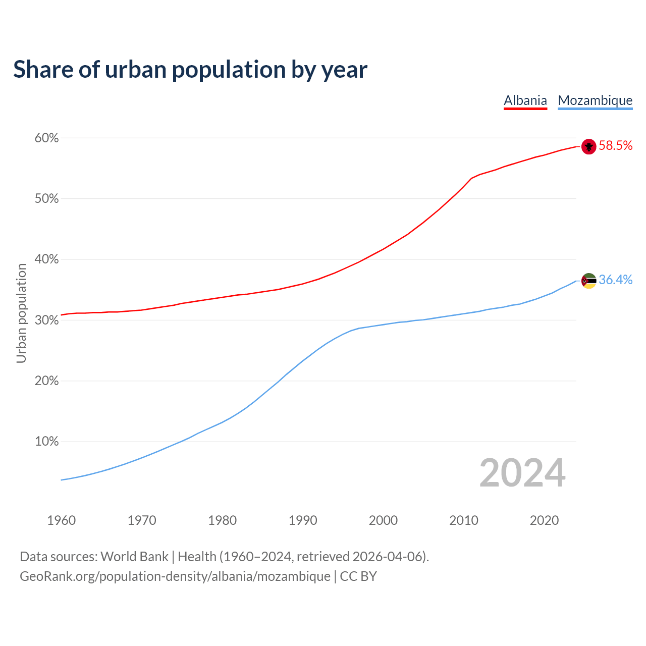 From 2004 to 2024, the share of urban population changed from 45% to 58.5% in Albania and from 29.9% to 36.4% in Mozambique.