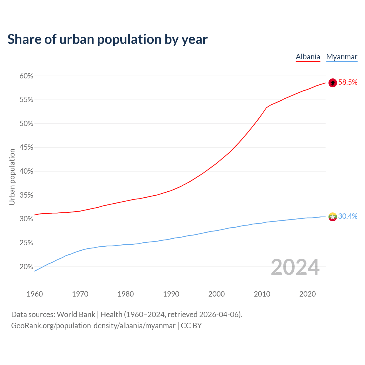 From 2004 to 2024, the share of urban population changed from 45% to 58.5% in Albania and from 28.2% to 30.4% in Myanmar.