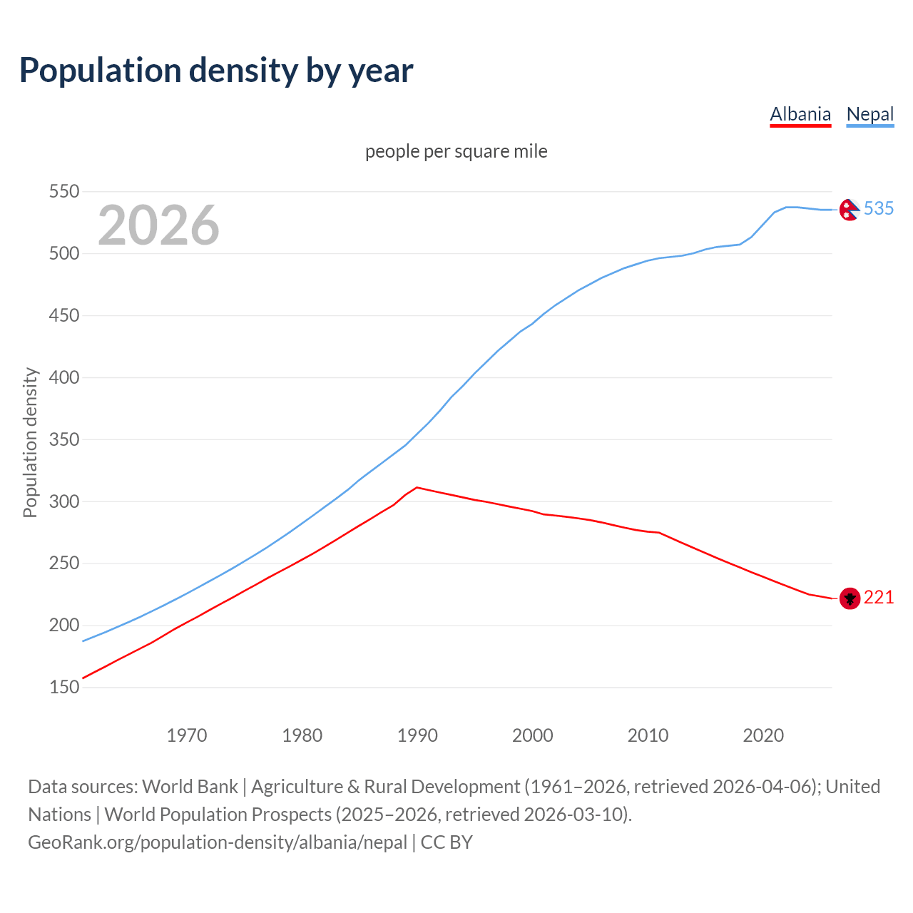 From 2006 to 2026, population density in Albania decreased by 21.7%, compared to a 11.4% growth in Nepal.