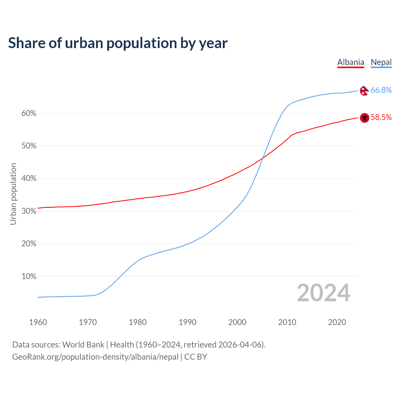 From 2004 to 2024, the share of urban population changed from 45% to 58.5% in Albania and from 41.6% to 66.8% in Nepal.