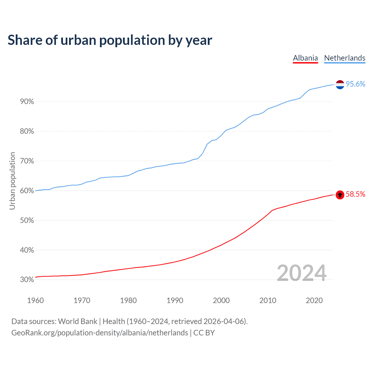 From 2004 to 2024, the share of urban population changed from 45% to 58.5% in Albania and from 82.3% to 95.6% in the Netherlands.