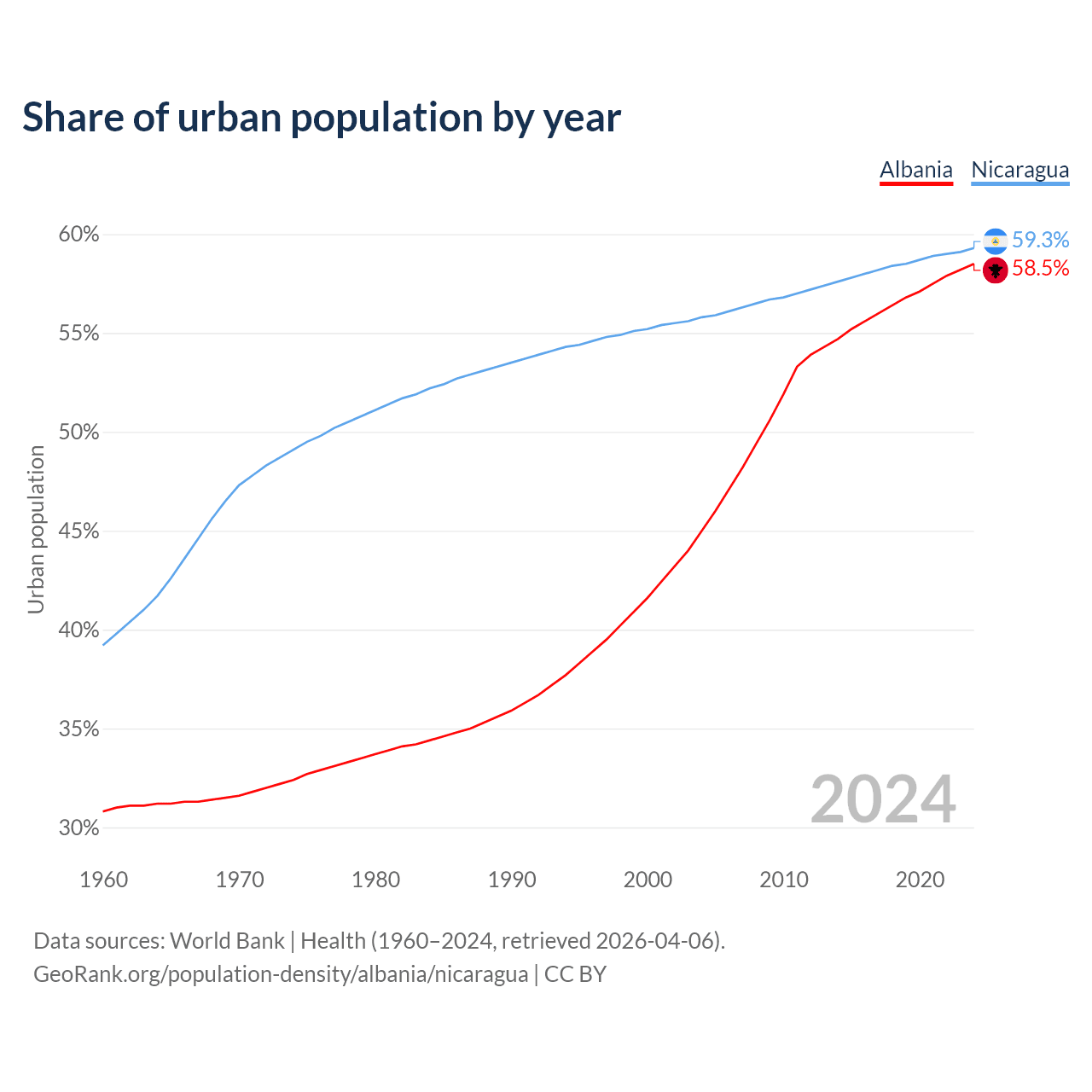 From 2004 to 2024, the share of urban population changed from 45% to 58.5% in Albania and from 55.8% to 59.3% in Nicaragua.