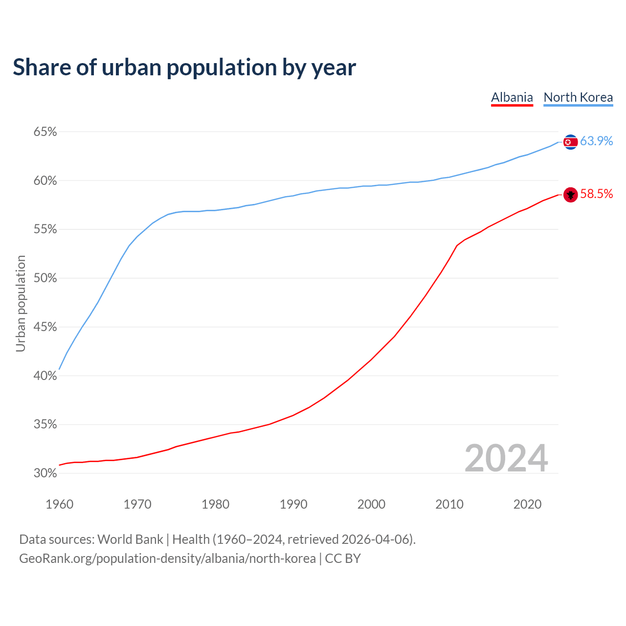 From 2004 to 2024, the share of urban population changed from 45% to 58.5% in Albania and from 59.7% to 63.9% in North Korea.