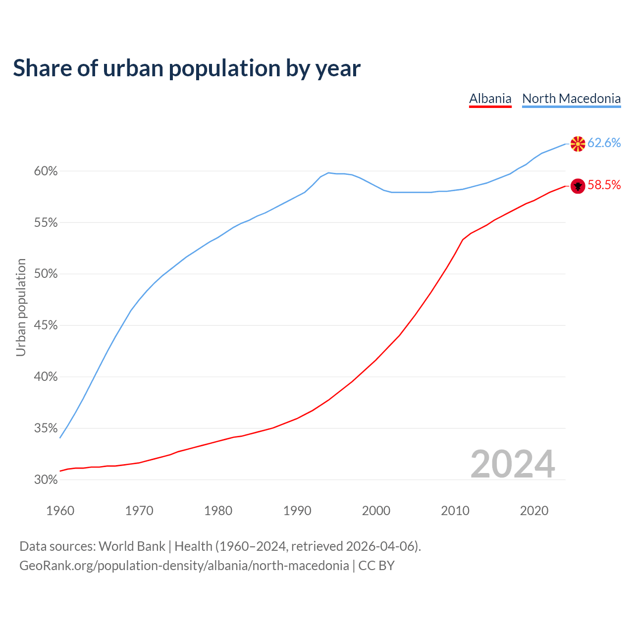 From 2004 to 2024, the share of urban population changed from 45% to 58.5% in Albania and from 57.9% to 62.6% in North Macedonia.
