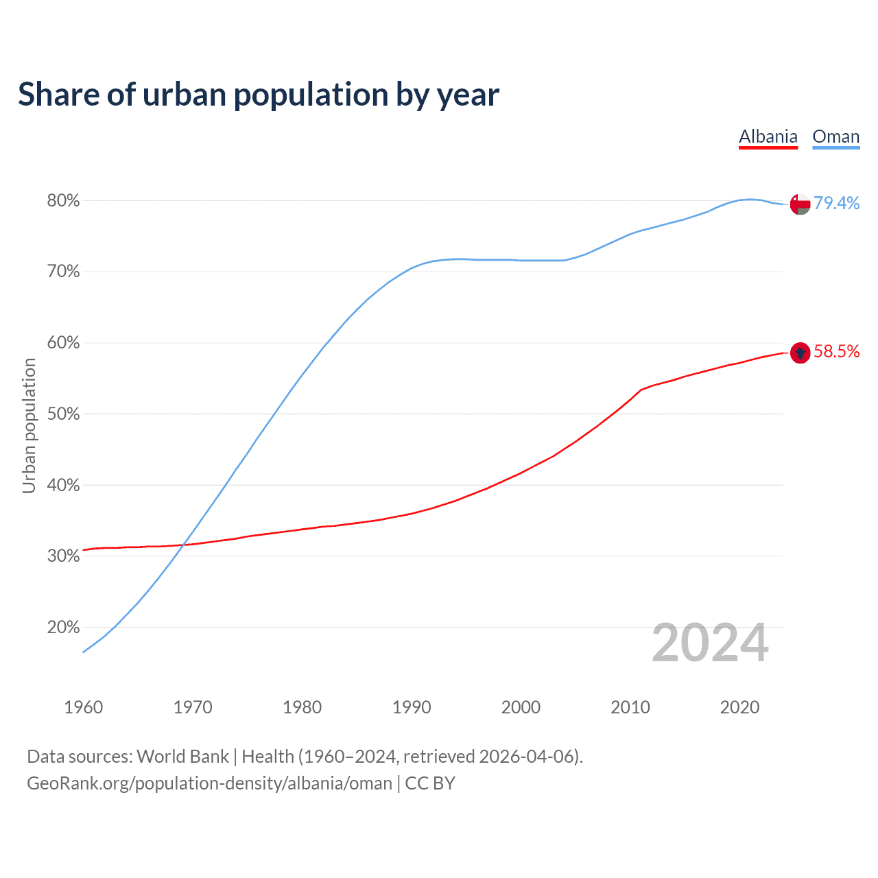 From 2004 to 2024, the share of urban population changed from 45% to 58.5% in Albania and from 71.5% to 79.4% in Oman.