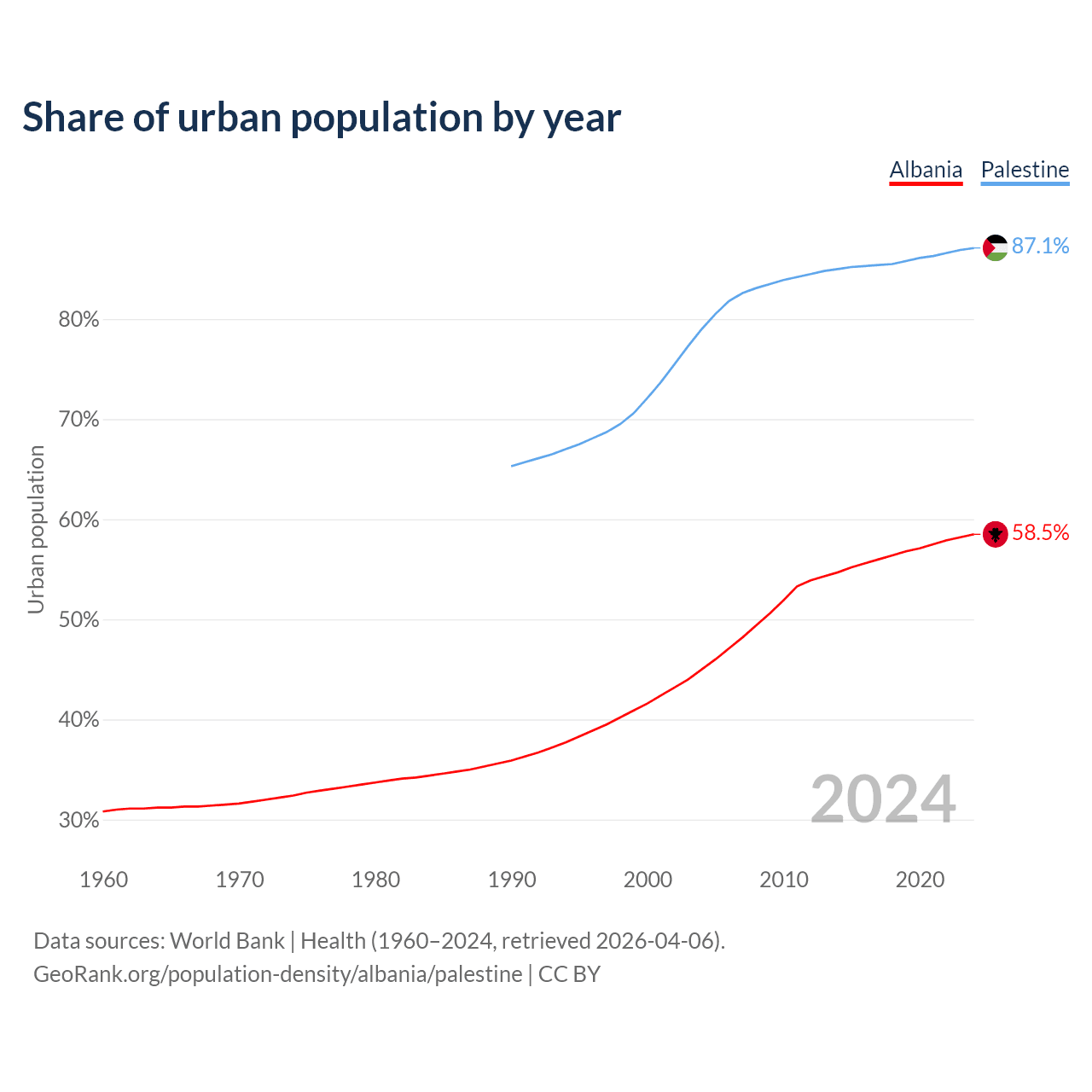 From 2004 to 2024, the share of urban population changed from 45% to 58.5% in Albania and from 79% to 87.1% in Palestine.