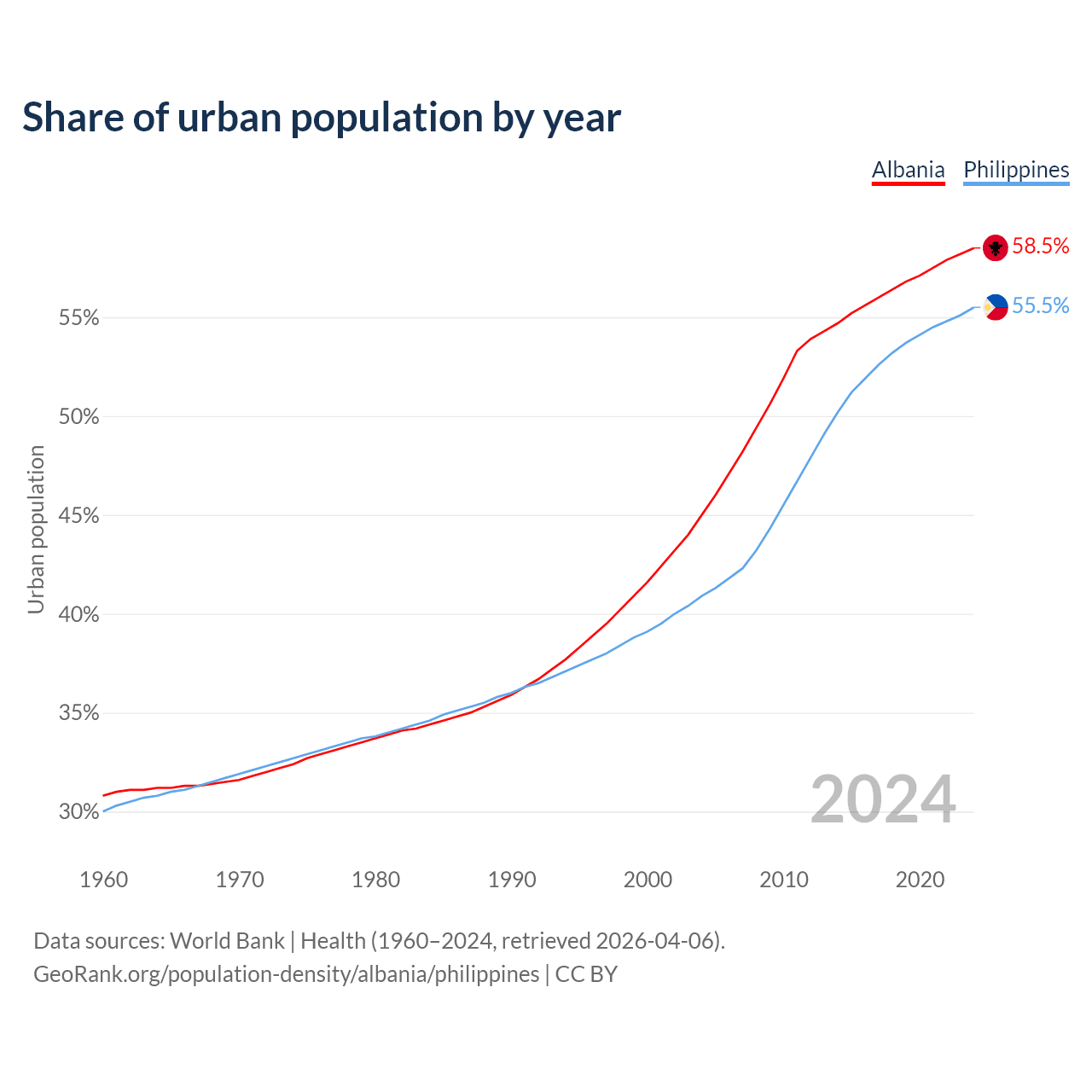 From 2004 to 2024, the share of urban population changed from 45% to 58.5% in Albania and from 40.9% to 55.5% in the Philippines.