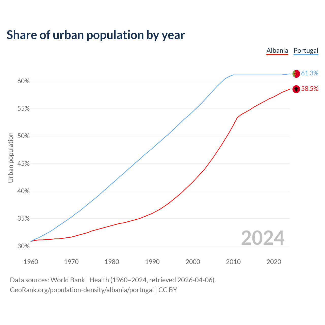 From 2004 to 2024, the share of urban population changed from 45% to 58.5% in Albania and from 57.4% to 61.3% in Portugal.