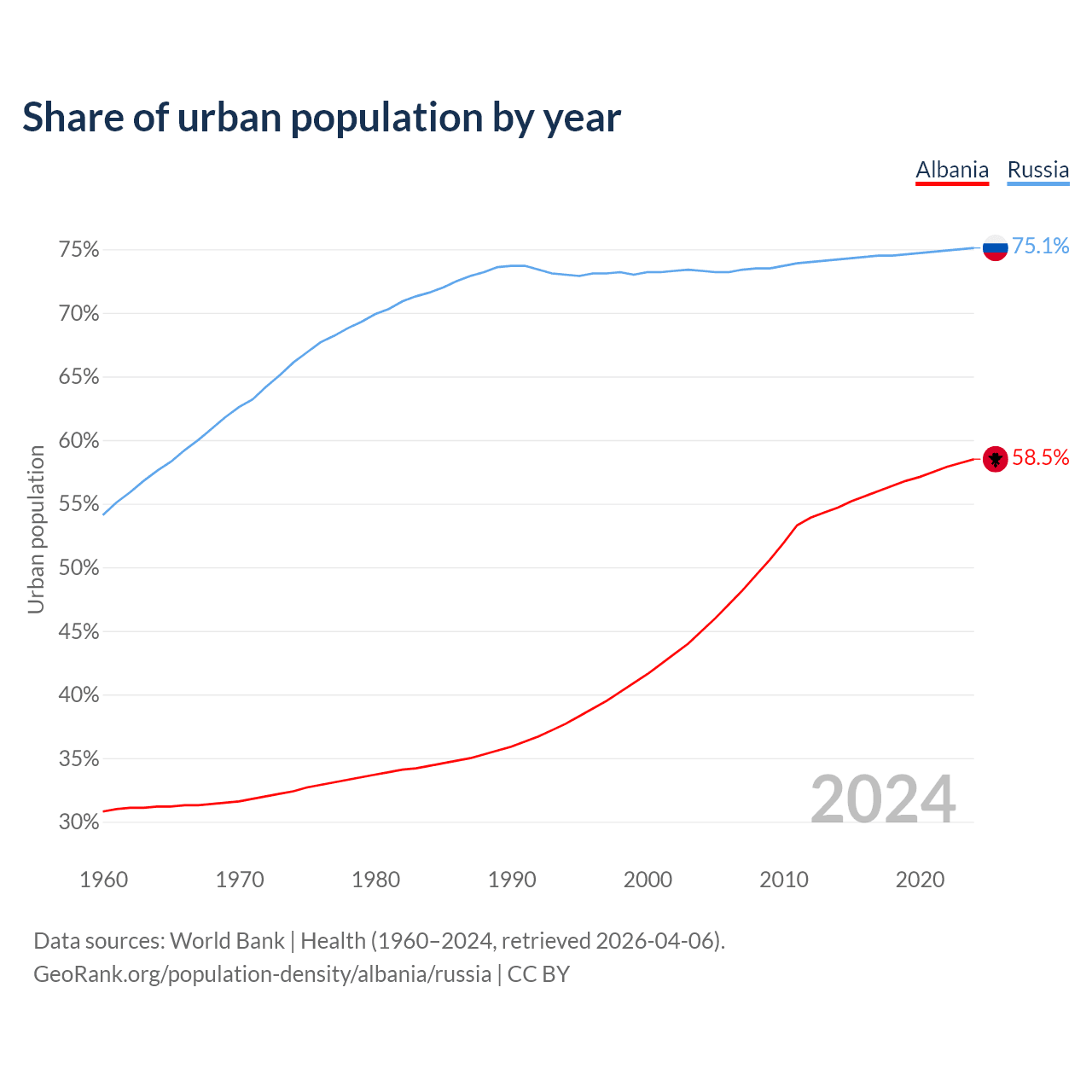 From 2004 to 2024, the share of urban population changed from 45% to 58.5% in Albania and from 73.3% to 75.1% in Russia.