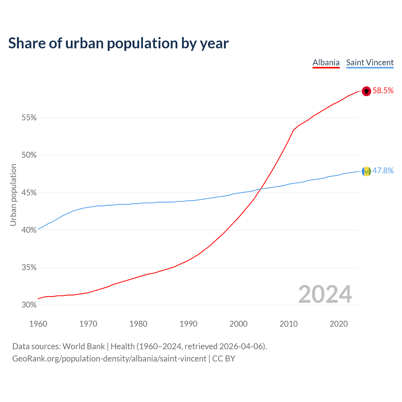 From 2004 to 2024, the share of urban population changed from 45% to 58.5% in Albania and from 45.4% to 47.8% in Saint Vincent.