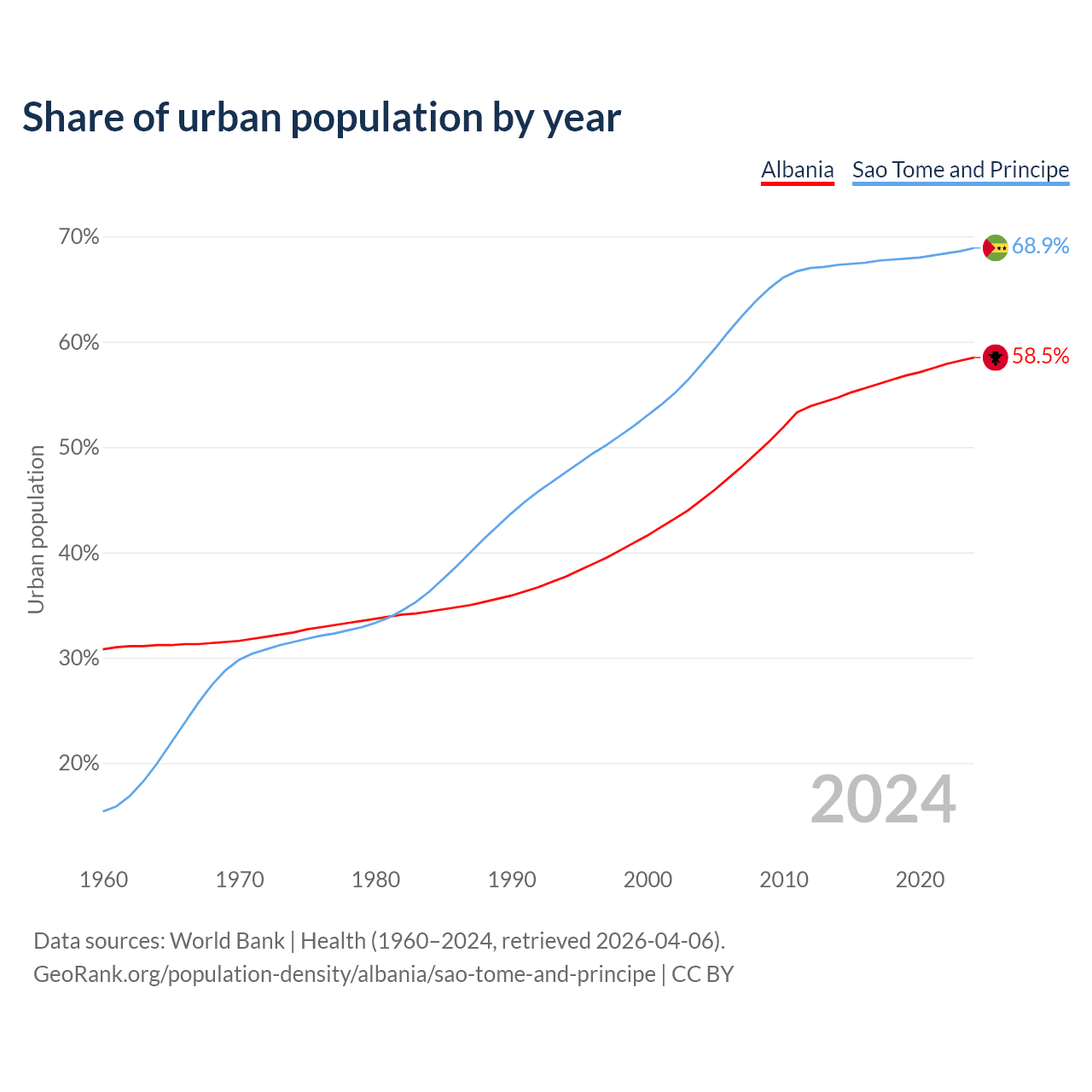 From 2004 to 2024, the share of urban population changed from 45% to 58.5% in Albania and from 57.9% to 68.9% in Sao Tome and Principe.