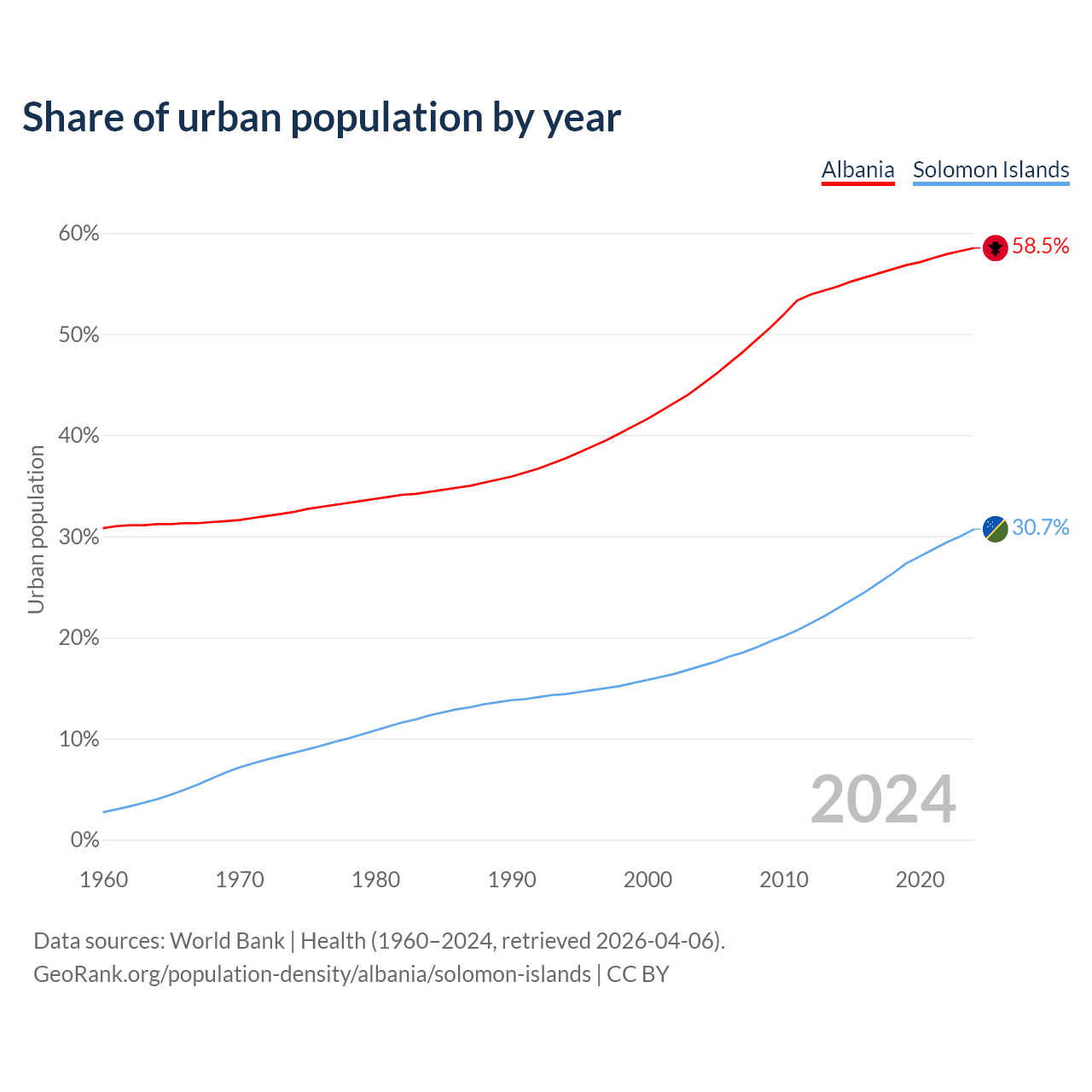 From 2004 to 2024, the share of urban population changed from 45% to 58.5% in Albania and from 17.2% to 30.7% in the Solomon Islands.