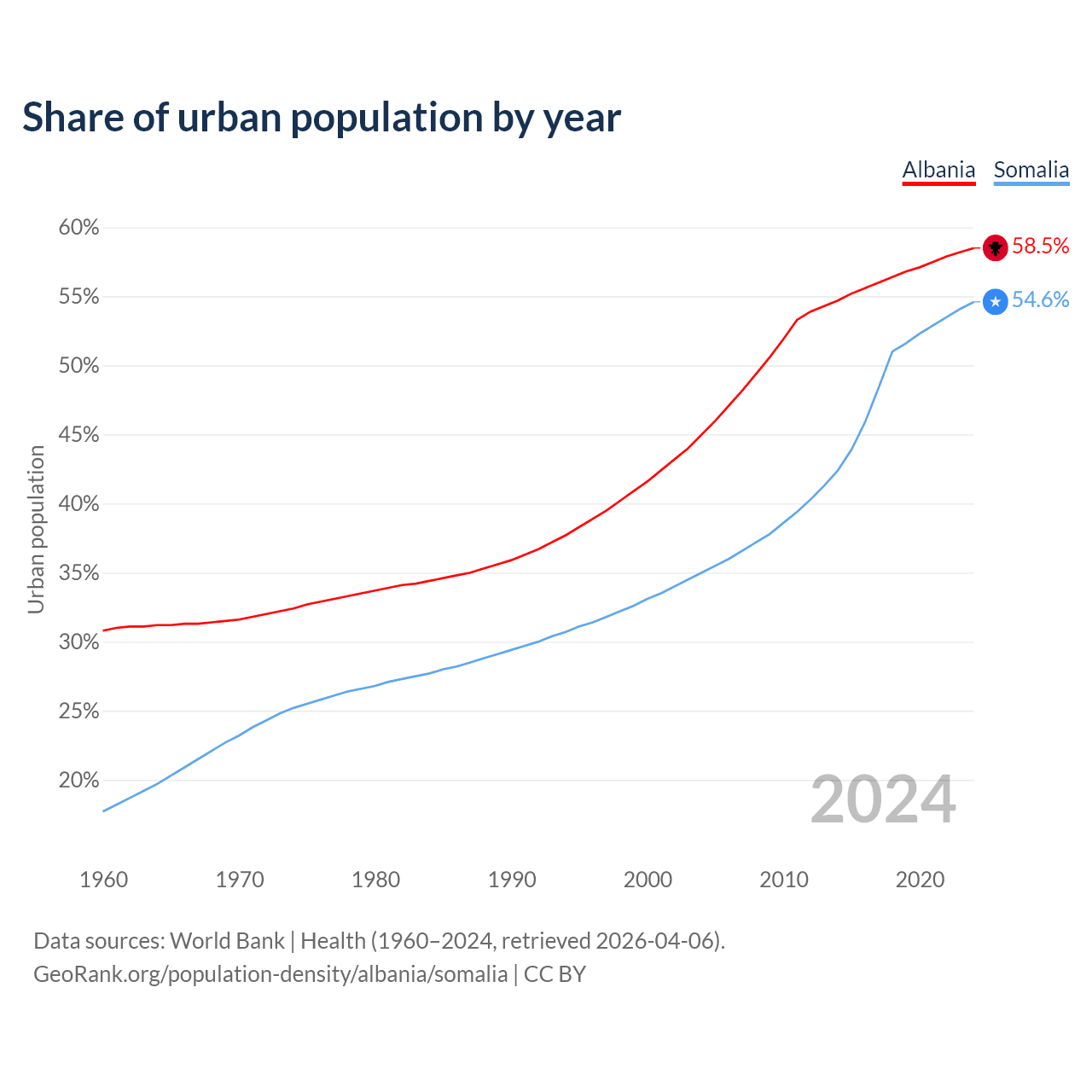 From 2004 to 2024, the share of urban population changed from 45% to 58.5% in Albania and from 35% to 54.6% in Somalia.