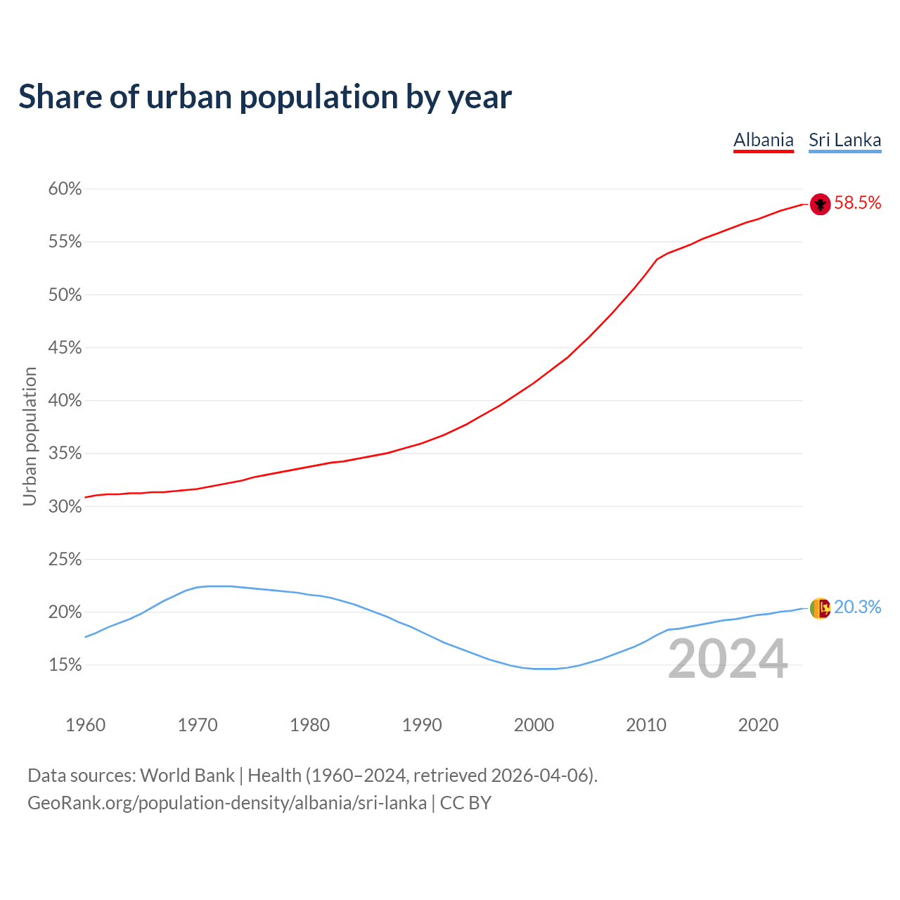 From 2004 to 2024, the share of urban population changed from 45% to 58.5% in Albania and from 14.9% to 20.3% in Sri Lanka.