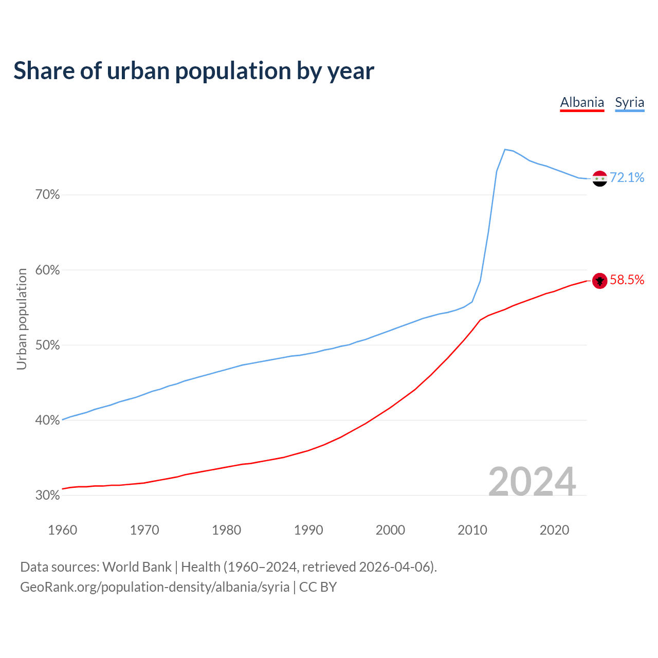 From 2004 to 2024, the share of urban population changed from 45% to 58.5% in Albania and from 53.5% to 72.1% in Syria.