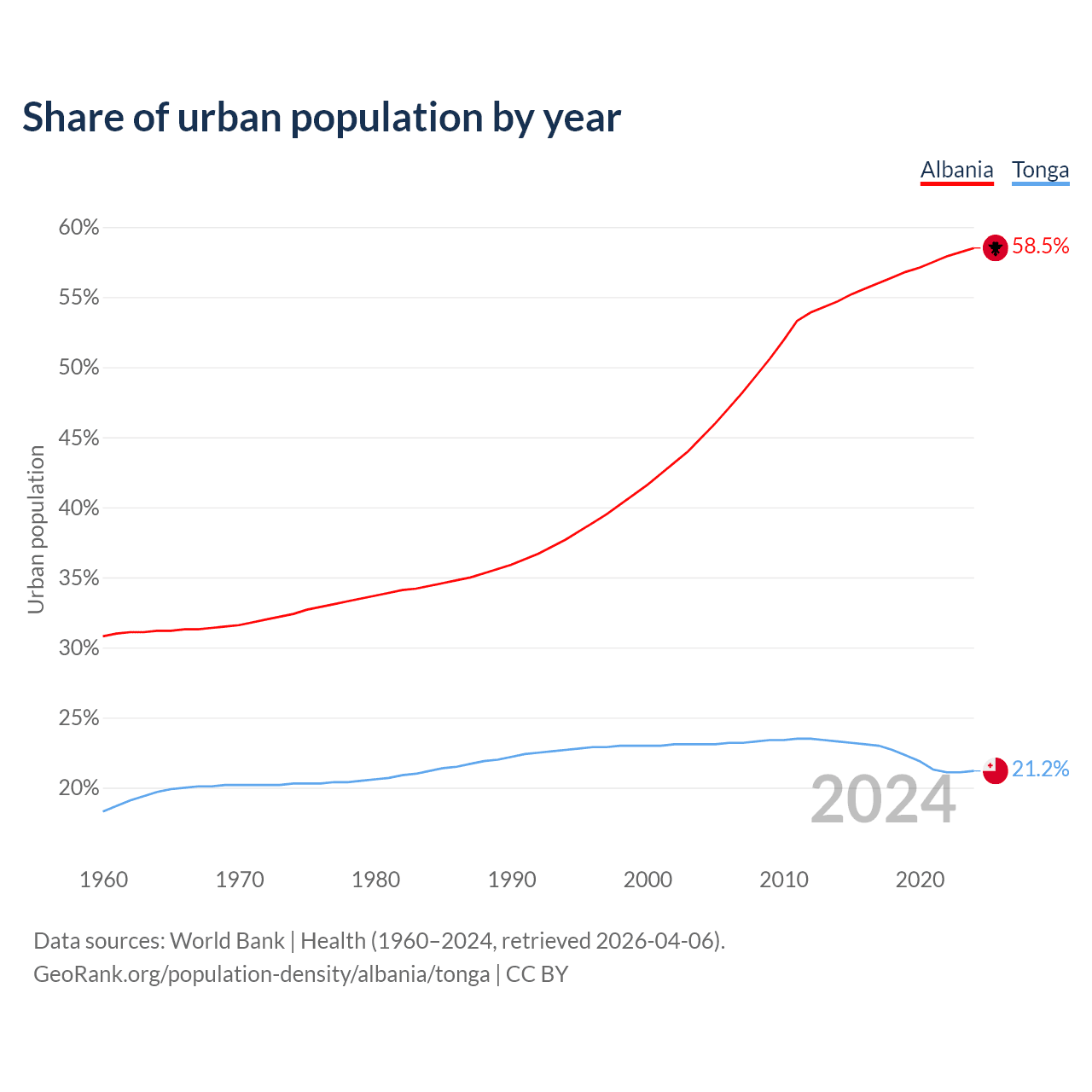 From 2004 to 2024, the share of urban population changed from 45% to 58.5% in Albania and from 23.1% to 21.2% in Tonga.