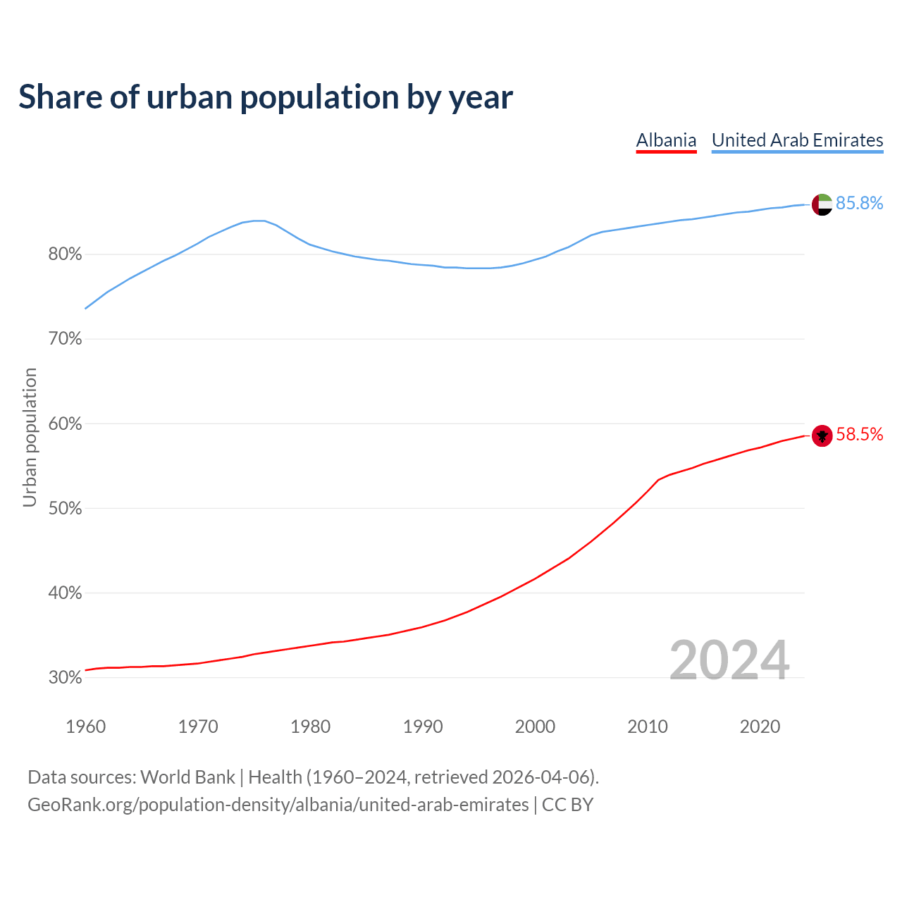 From 2004 to 2024, the share of urban population changed from 45% to 58.5% in Albania and from 81.5% to 85.8% in the United Arab Emirates.