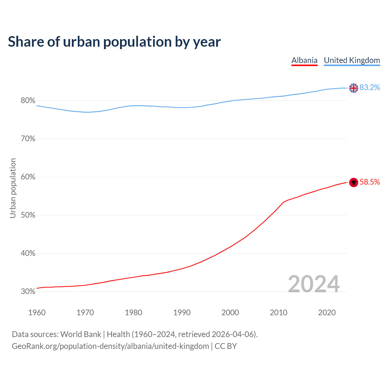 From 2004 to 2024, the share of urban population changed from 45% to 58.5% in Albania and from 80.3% to 83.2% in the United Kingdom.